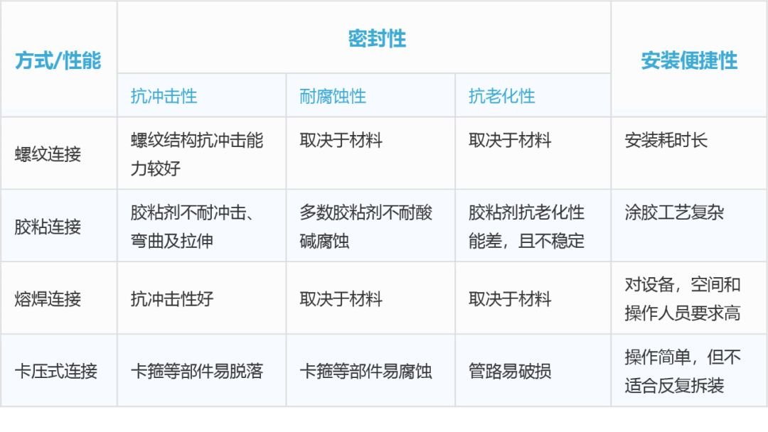 由对比得知,除卡压式连接外,其他的主流连接方式都存在安装费时费力的短板,卡压式连接件因自身不耐冲击,易腐蚀老化,也使得其安装方便的优势沦为鸡肋。