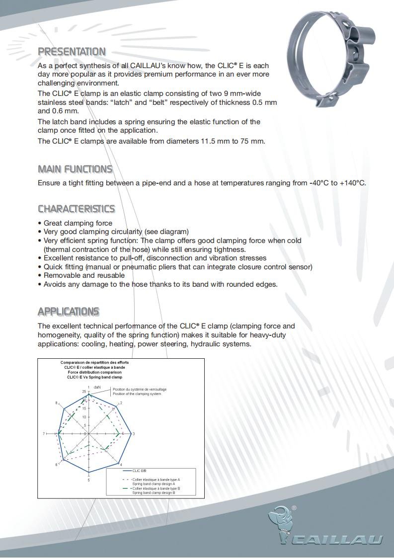 The excellent technical performance of the CLIC® E clamp (clamping force and  homogeneity, quality of the spring function) makes it suitable for heavy-duty  applications: cooling, heating, power steering, hydraulic systems.