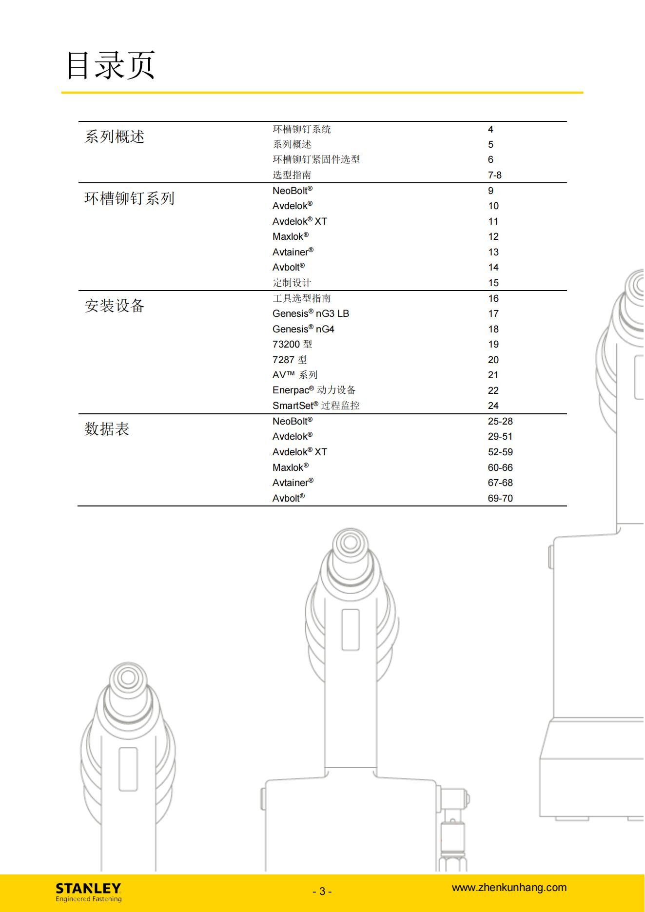 3、 性能稳定强大 我们的环槽铆钉系统经精密设计和制造,确保始终如一的精 确、牢固和高强度装配。配合专用工具,我们的环槽铆钉可 杜绝传统装配方法的安装错误或夹紧力变化。