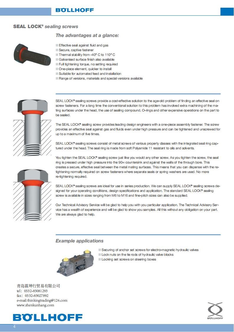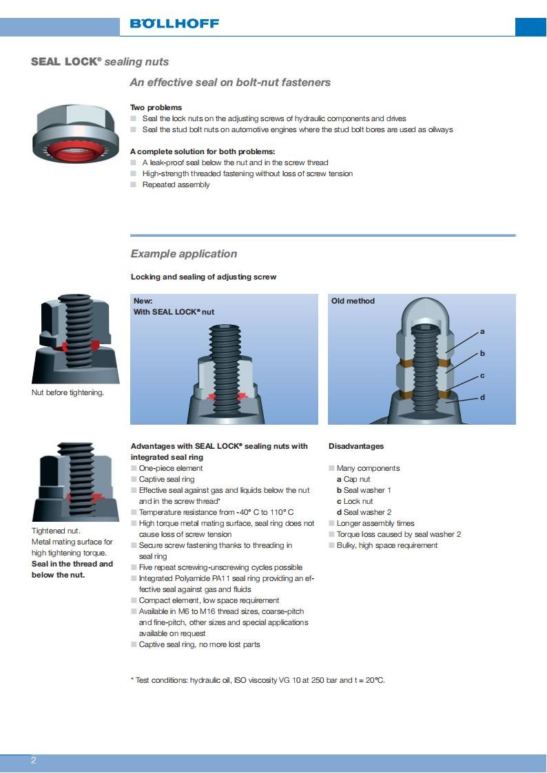 SEAL LOCK®  sealing screws provide a cost-effective solution to the age-old problem of finding an effective seal on screw fasteners. For a long time the conventional solution to this problem has involved extra machining of the ma-  ting surfaces under the head, the use of sealing compound, O-rings and other expensive operations on the part to be sealed.