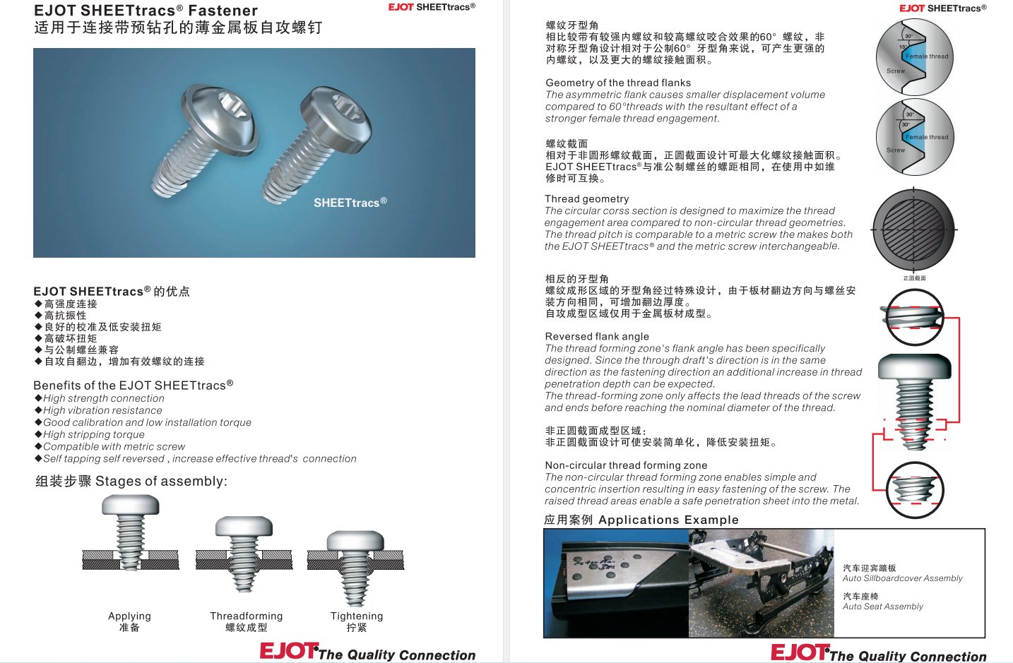 相对于非圆形螺纹截面,正圆截面设计可最大化螺纹接触面积。EJOT SHEETtracs⑧与准公制螺丝的螺距相同,在使用中如维修时可互换。