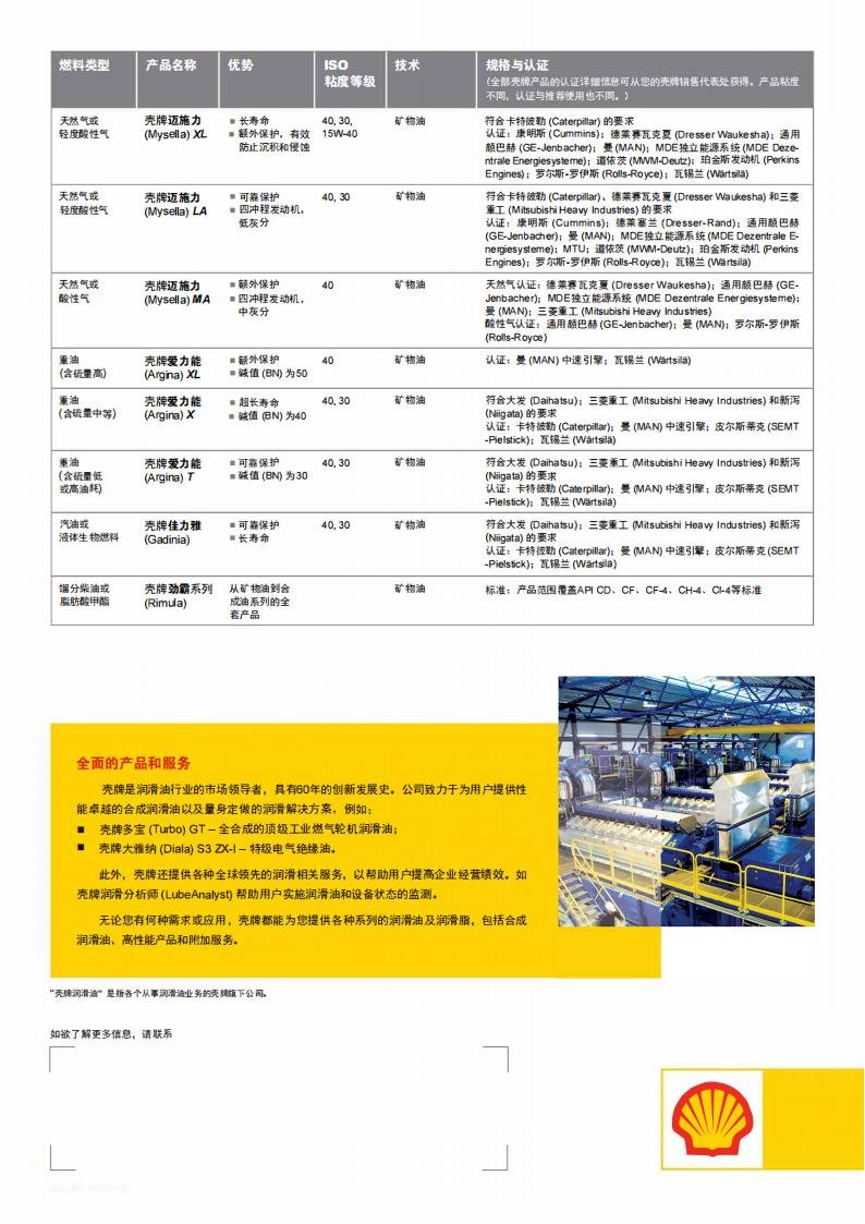 优化润港油的使用春合早责院发申机组润沿油发展的核心。针对壳牌爱力能(Argina)系列,正确选择产品和润滑油状态监测有助于优化操作成本。壳牌迈施力(Mysella)XL为现代化高效率的燃气机组设立了新的班计油使用寿命基准,而月已被一些机组制造商列为特级或“长效艳油周期”的润滑油